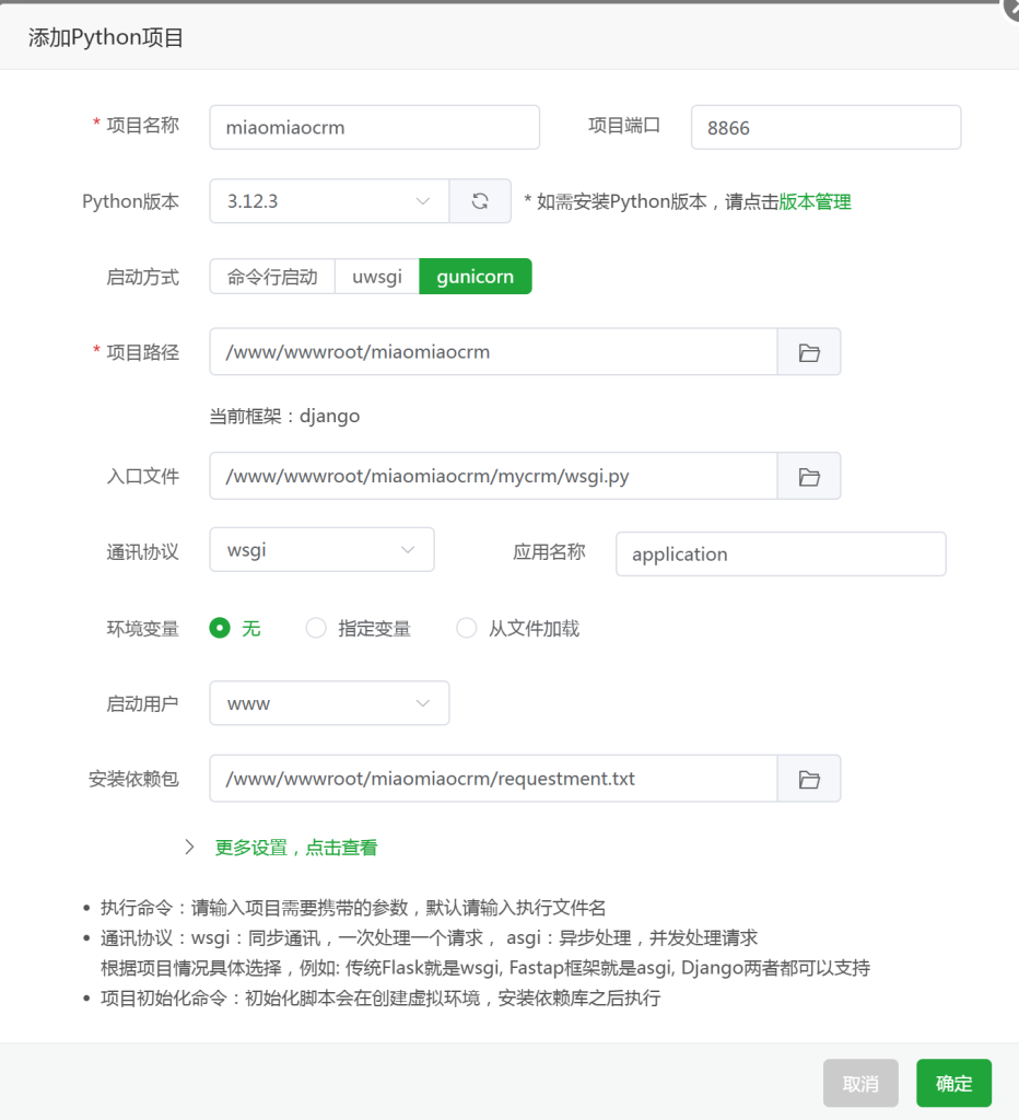 然后我们在服务器上创建个新的MySQL数据库,记得数据库名称、用户和密码,同步修改到/www/wwwroot/miaomiaocrm/mycrm/setting.py文件。