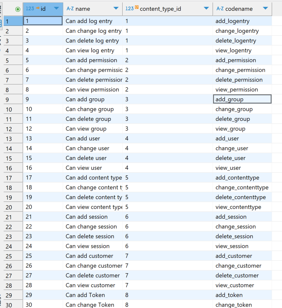 这些权限存储在auth_permission表中,并通过content_type_id关联到django_content_type表。